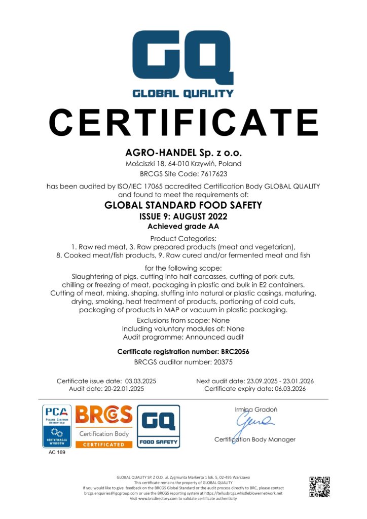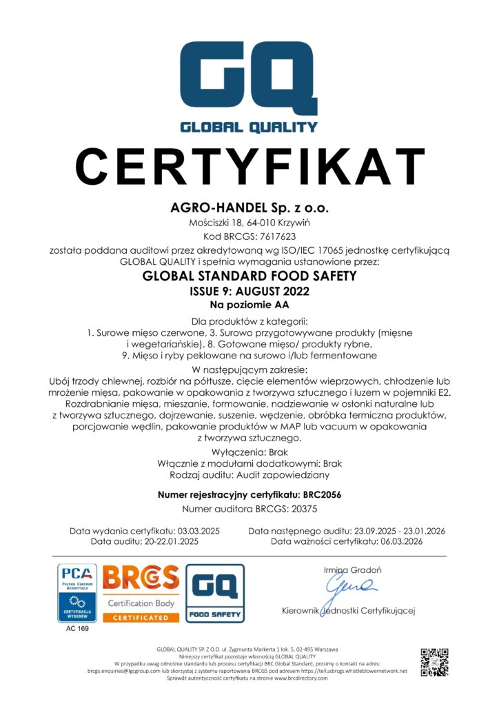 W Agro-Handel przywiązujemy ogromną wagę do jakości i bezpieczeństwa naszych produktów. Posiadamy certyfikaty potwierdzające spełnienie międzynarodowych standardów, w tym BRCGS (Global Standard Food Safety) na poziomie AA. Regularne audyty i rygorystyczne procedury kontroli jakości sprawiają, że nasze wyroby cieszą się zaufaniem klientów zarówno w kraju, jak i za granicą.